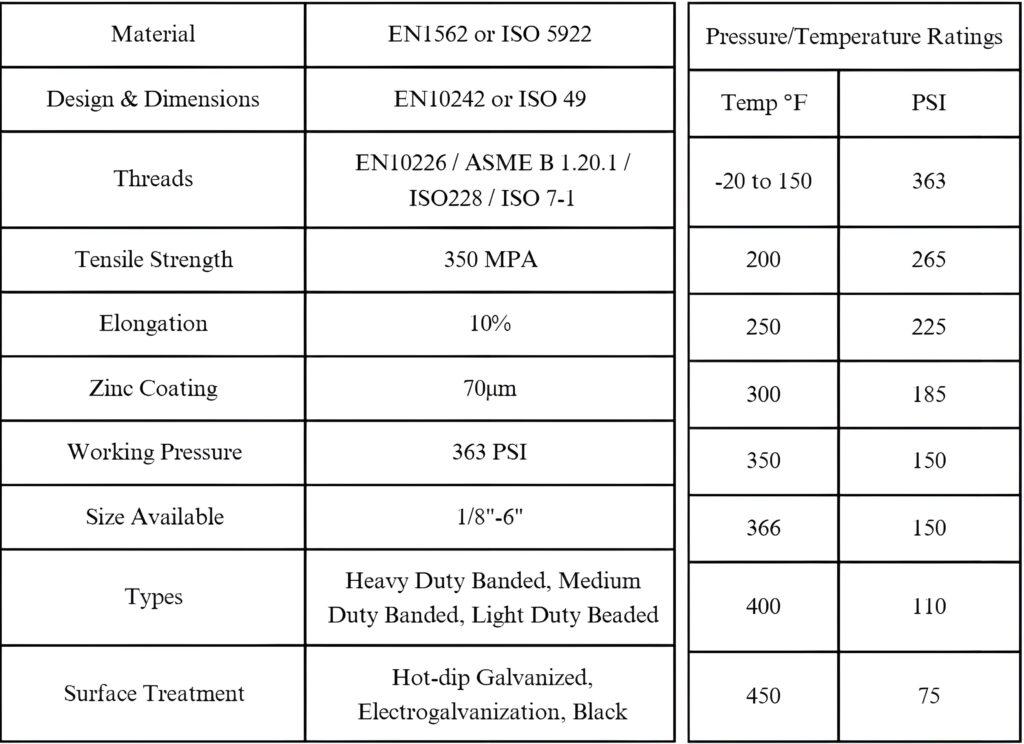 In this brochure, Jianzhi brand threaded pipe fittings in malleable cast iron conform to the international IOS49 and the European EN 10242 standards. The connecting threads conform the international ISO 7-1 and to the European EN 10226. The material used is highly quality blackheart malleable cast iron