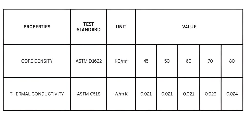 The following table contains the typical foam physical properties of FCF free PU system and tested under respective ASTM and ISO standard.